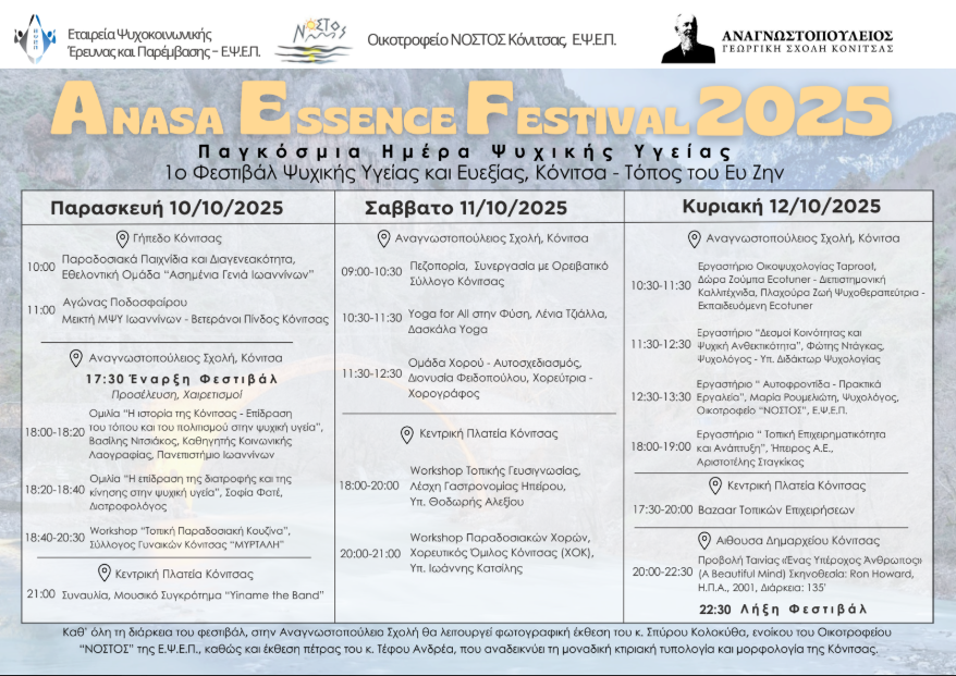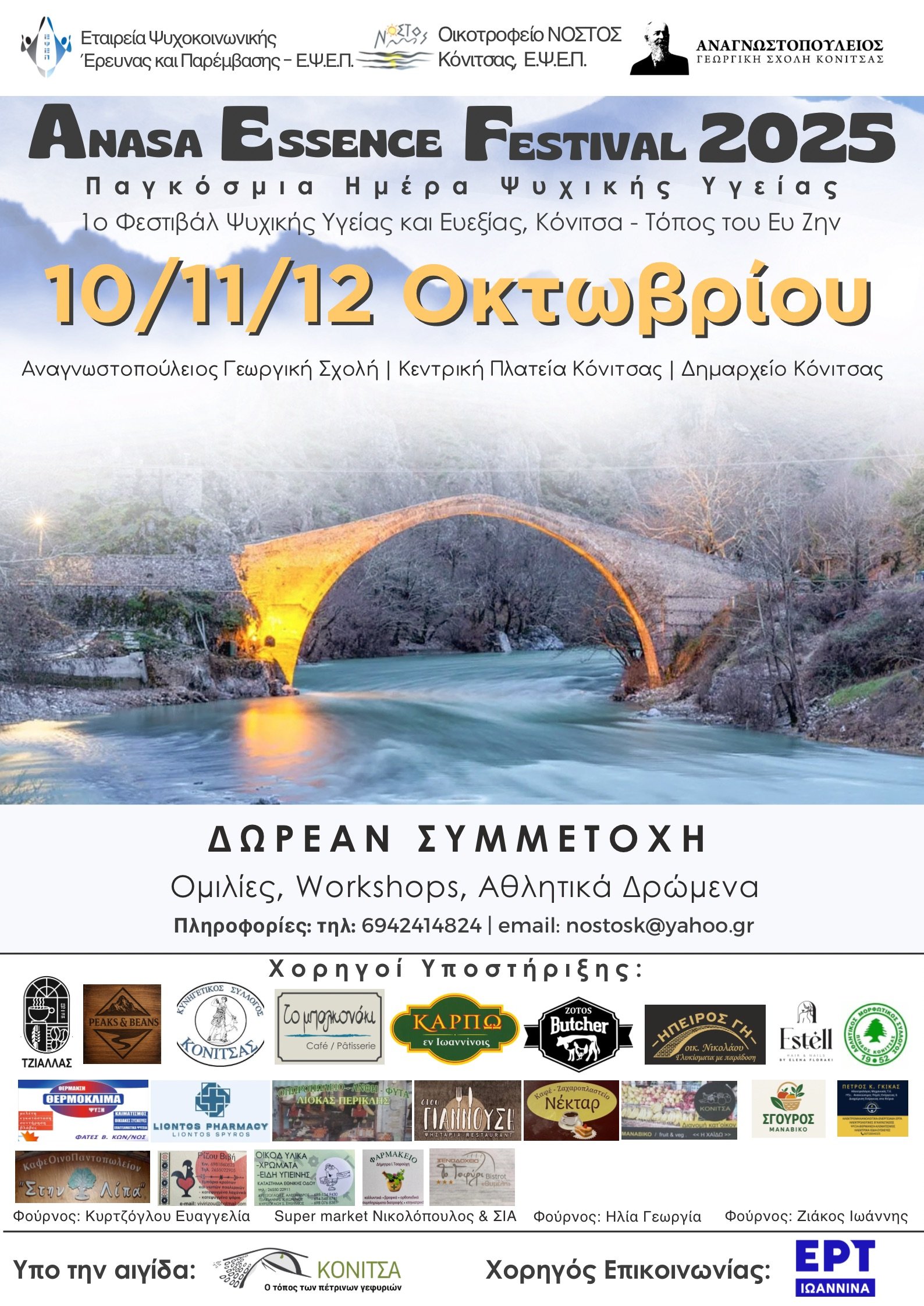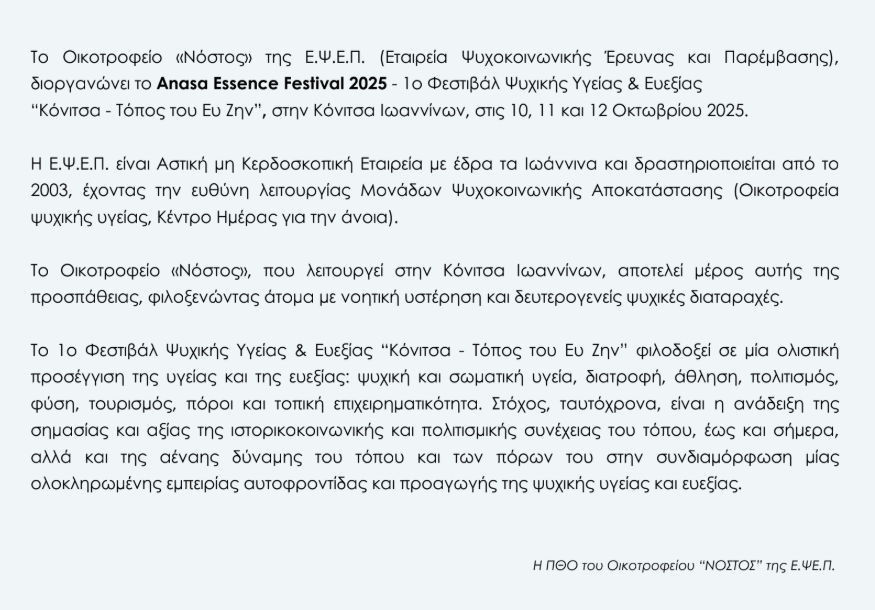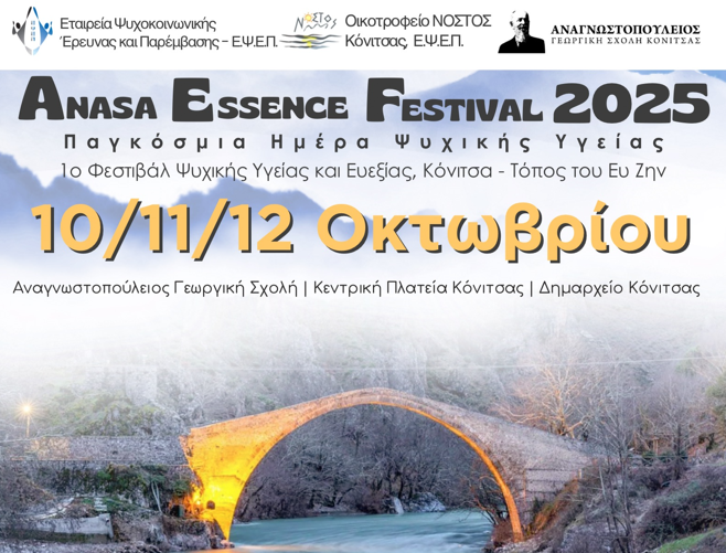 Με ένα πλούσιο πρόγραμμα σε ένα τριήμερο υγείας και ευεξίας, το Οικοτροφείο «Νόστος» της Ε.Ψ.Ε.Π. (Εταιρεία Ψυχοκοινωνικής Έρευνας και Παρέμβασης), διοργανώνει το Anasa Essence Festival 2025 – 1ο Φεστιβάλ Ψυχικής Υγείας & Ευεξίας “Κόνιτσα – Τόπος του Ευ Ζην”, στην Κόνιτσα Ιωαννίνων, στις 10, 11 και 12 Οκτωβρίου 2025.